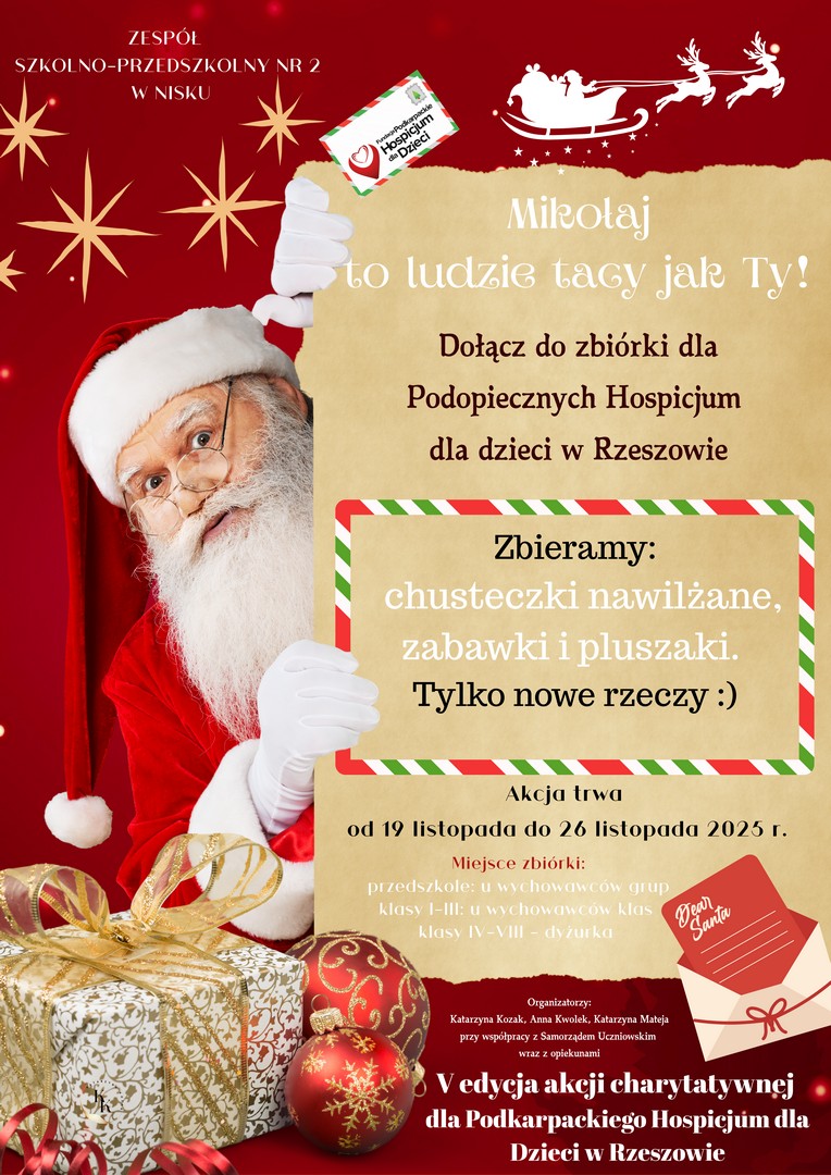 W ostatnich dniach listopada przeprowadziliśmy w Zespole Szkolno – Przedszkolnym nr 2 w Nisku - V akcję charytatywną, której celem była zbiórka chusteczek nawilżanych, pluszowych misiów oraz zabawek dla Hospicjum dla Dzieci w Rzeszowie. Dzięki zaangażowaniu wielu życzliwych osób udało się zgromadzić pokaźną ilość zarówno artykułów higienicznych, jak i nowych maskotek. Każdy podarowany miś to uśmiech i wsparcie dla dzieci, które na co dzień zmagają się z chorobą. Zebrane chusteczki pomogą hospicjum w codziennym funkcjonowaniu i zapewnią niezbędne wyposażenie na dłuższy czas.
