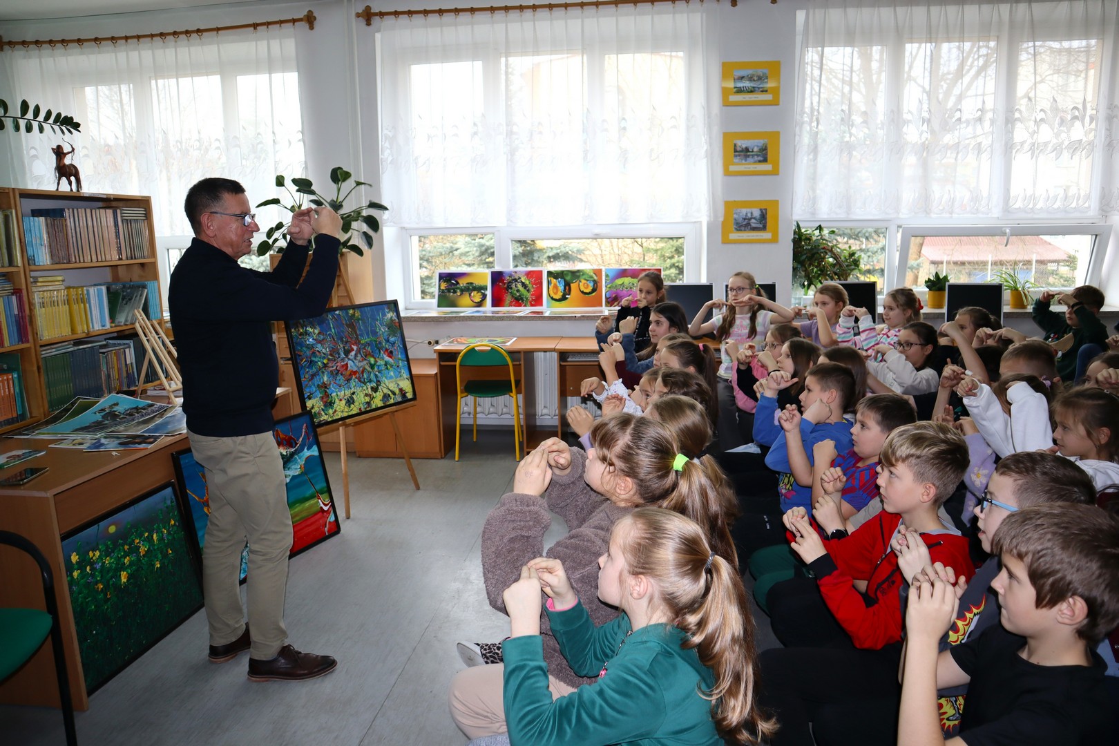 W trakcie spotkań nasz gość opowiadał o swojej twórczości i pasjach oraz o tym, skąd czerpie inspiracje. Pokazywał swoje abstrakcyjne obrazy i fotografie makro – czyli zrobione w bardzo dużym powiększeniu. Na fotografiach uczniowie mogli zobaczyć m.in. kropelki rosy, motyle, biedronki, żuka leśnego, trzmiela, komara, mszyce.